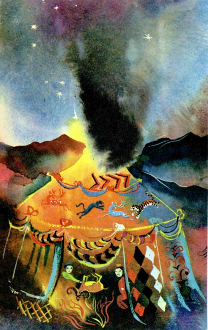 Старый батор и его разведчик долго шли по широкой степи Шамша, прислушиваясь к ночным шорохам травы. Наконец они увидели множество огней. Сколько их было, трудно подсчитать, как нельзя подсчитать большой табун лошадей, сбившийся в кучу среди степи. Это горели костры, разведенные воинами Ээлэн-батора.