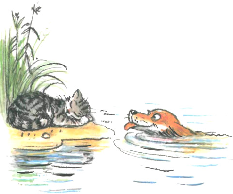Но подросСынок приёмный,И теперь он пёсОгромный.Бедной маме не под силуМыть лохматого верзилу.На громадные бокаНе хватает языка.Чтобы вымыть шеюСыну,Надо влезтьЕму на спину.— Ox, — вздохнула кошка-мать, —Трудно сына умывать!Сам плескайся, сам купайся,Сам без мамы умывайся.