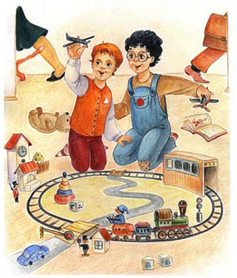 Мама пошла на кухню. А Коля с Петей остались в комнате. И стали играть в игрушки.
