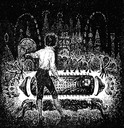 Миша — к надзирателю. Смотрит: он в самом деле лежит на диване, в халате и с боку на бок переворачивается, только всё лицом кверху. А по халату-то у него шпильки, крючочки видимо-невидимо; только что попадётся ему молоток, он его крючком сперва зацепит, потом спустит, а молоточек-то и стукнет по колокольчику.