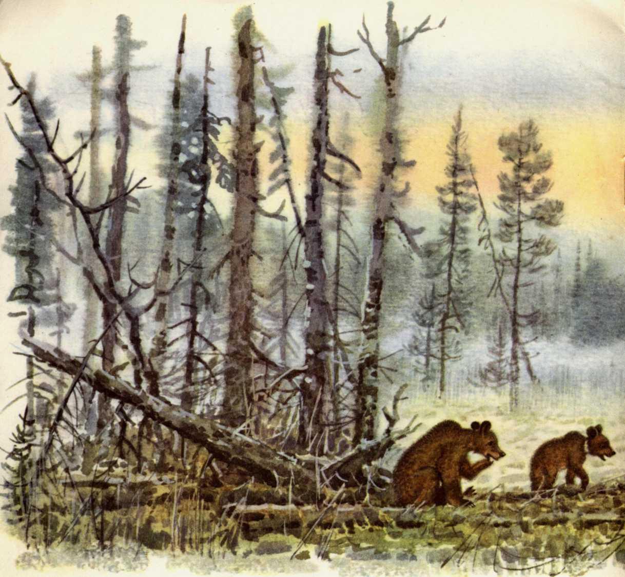 Шли как обычно: впереди мать, за ней маленький медвежонок, позади пестун. Болота давно от снега освободились и алели красной ягодой — прошлогодней клюквой. Медведица и медвежата лапами загребали целые куртины и в рот отправляли, сочные ягоды глотали, а мох выбрасывали. Солнце уже высоко поднялось — отправились медведица с медвежатами отдыхать: в самую чащу–чапыгу забрались. До позднего вечера спали. Заря уже на западе догорала, когда повела мать своих детей на поле у края леса: там озимые хлеба зеленели. До утра ели эту зелень, паслись, как коровы на лугу.