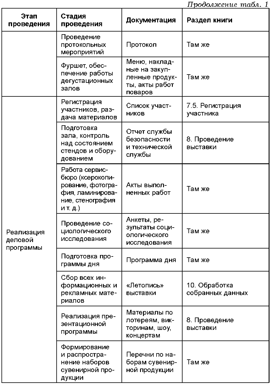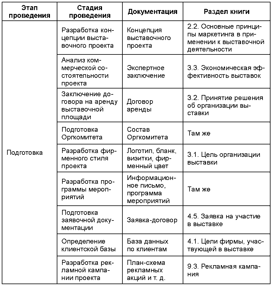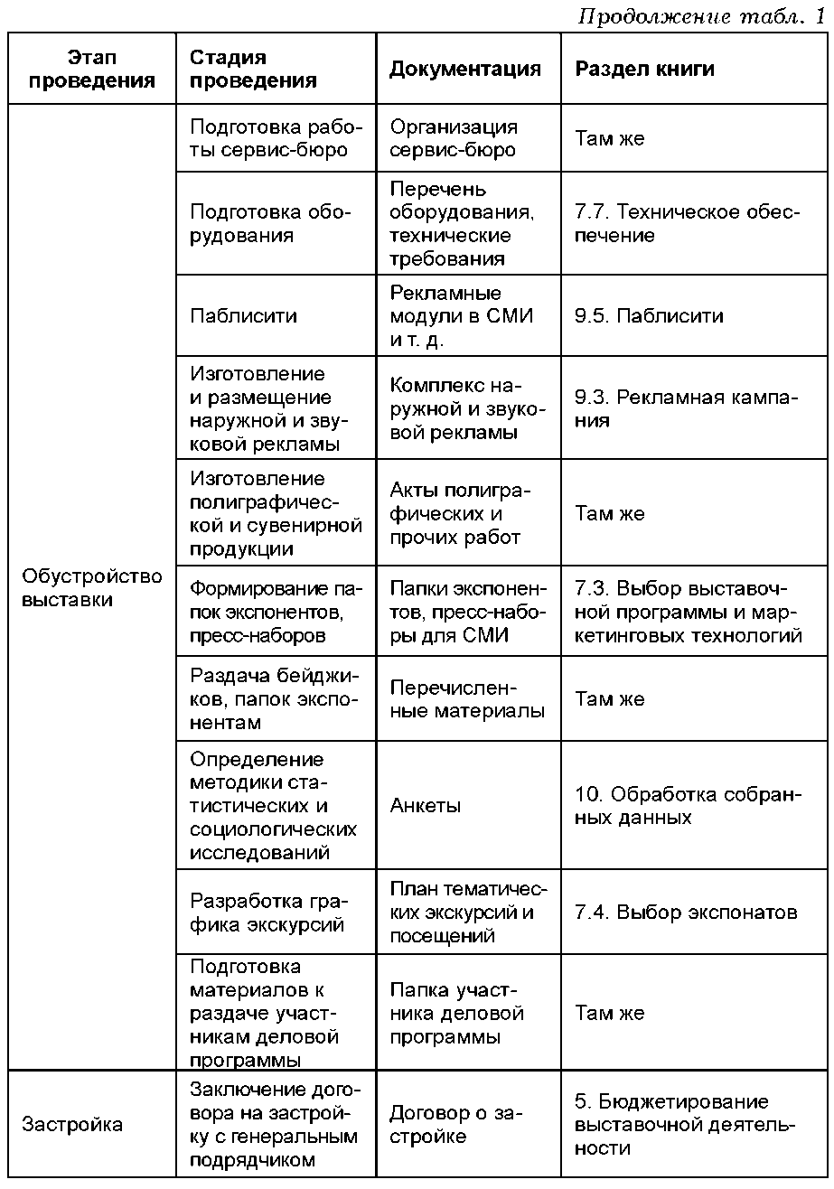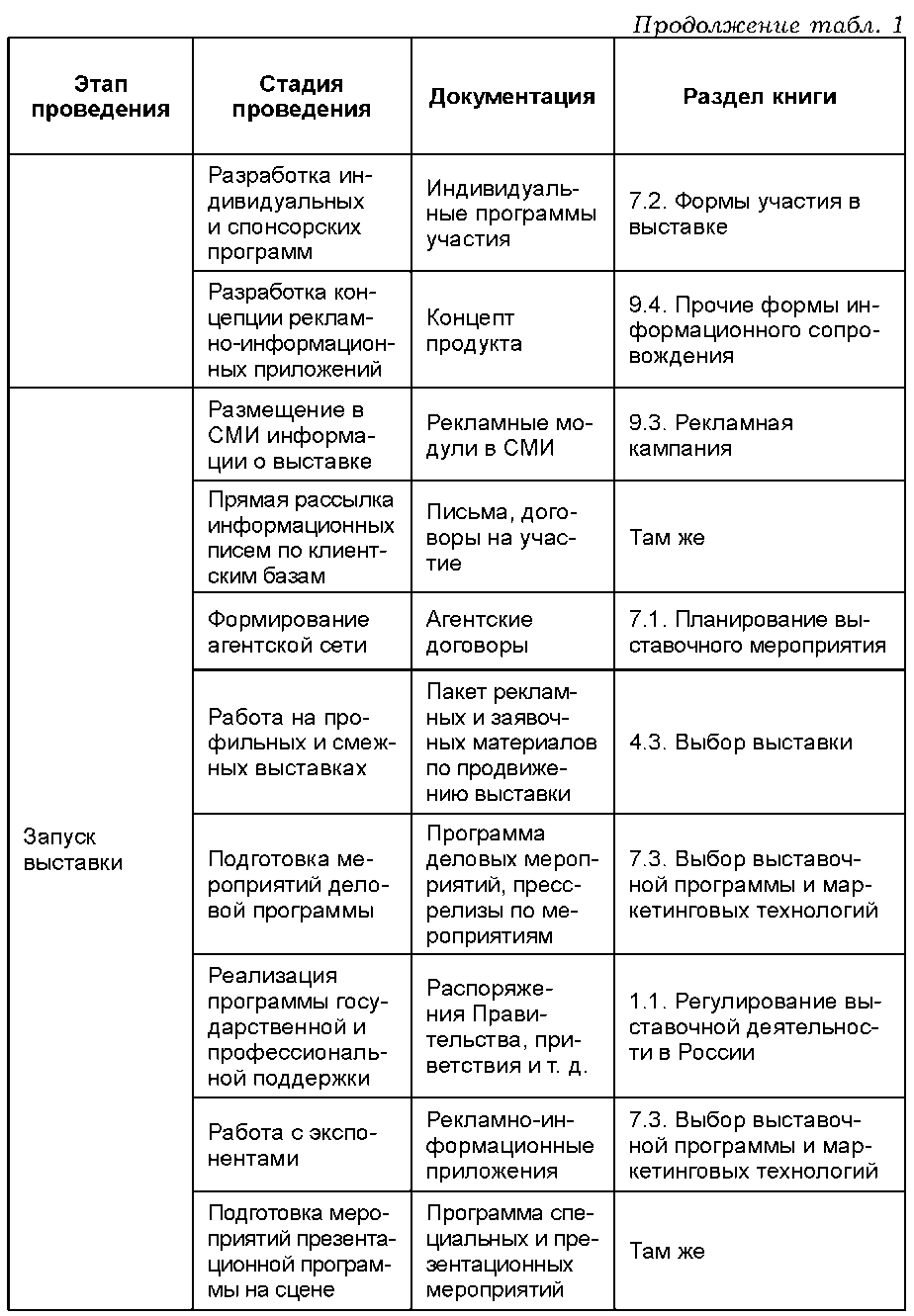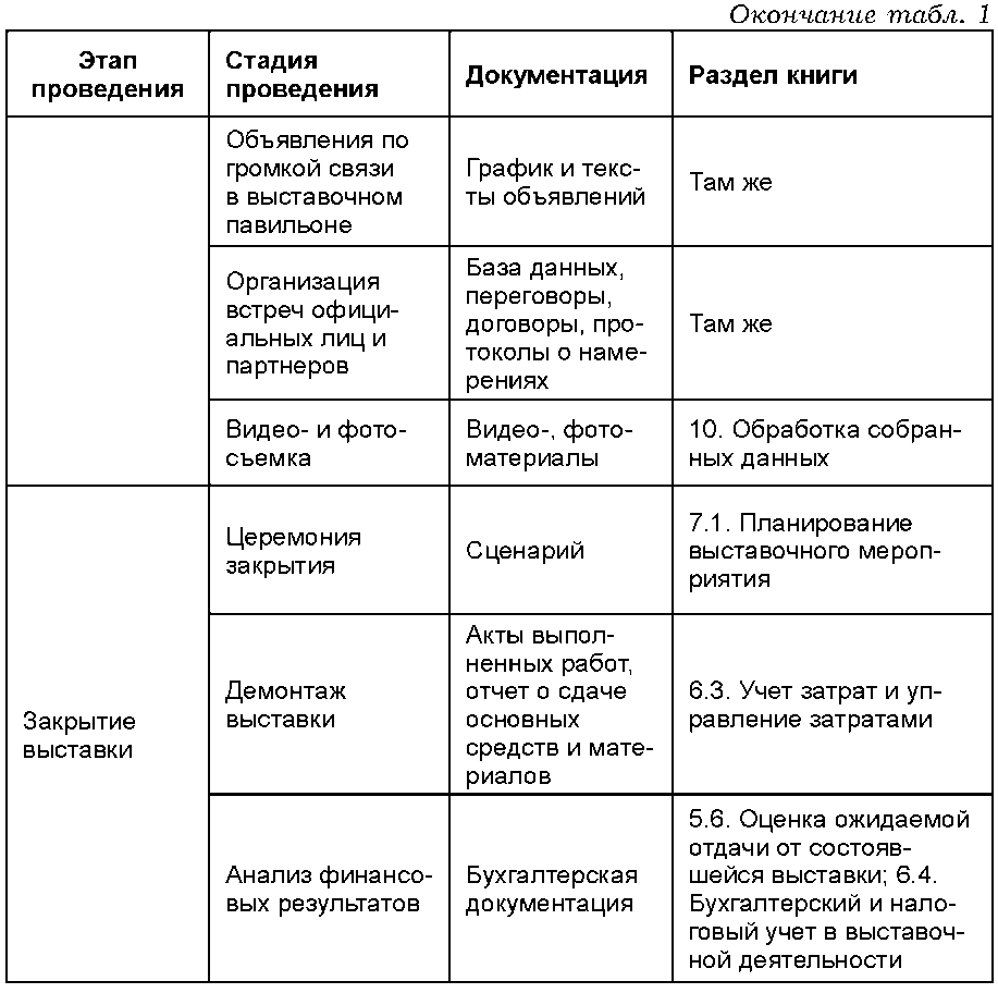 Материалы книги сгруппированы тематически, поэтому для удобства читателя ниже размещается таблица 1, представляющая собой нечто вроде «карты» издания. Данная карта располагает материалы книги в той последовательности, в которой естественным путем размещаются во времени этапы и стадии мероприятия, начиная от планирования и заканчивая демонтажом экспозиции.