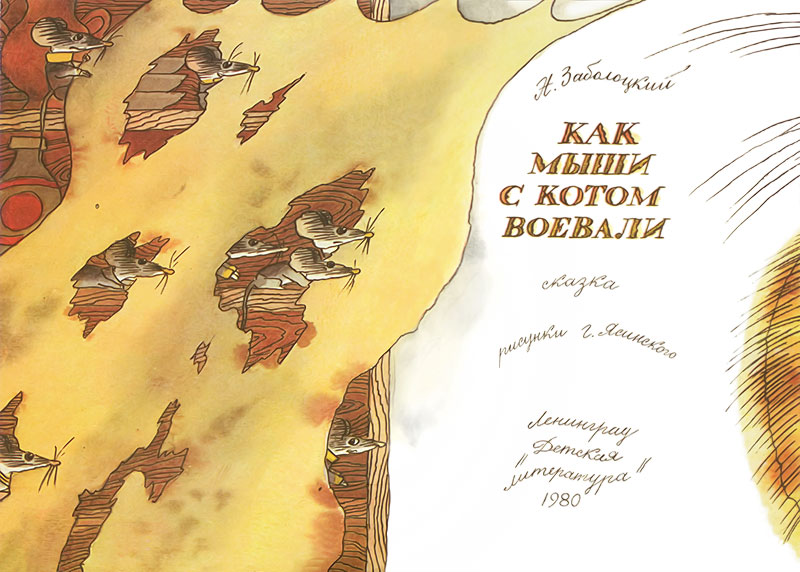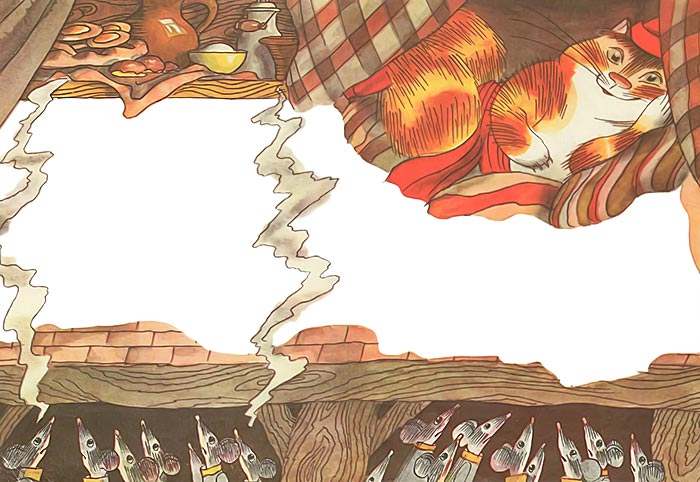 А котище лежит на печке,Глазищи горят как свечки.Лапками брюхо поглаживает,На кошачьем языке приговаривает:— Здешние, — говорит, — мышатаВкуснее, — говорит, — шоколада,Поймать бы их мне штук двести —Так бы и съел всех вместе!А мыши в мышиной норкеДоели последние корки,Построились в два рядаИ пошли войной на кота.Впереди генерал Культяпка,На Культяпке — железная шляпка,За Культяпкой — серый Тушканчик,Барабанит Тушканчик в барабанчик,За Тушканчиком — целый отряд —Сто пятнадцать мышиных солдат.