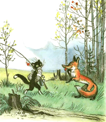 Пошёл Кот дальше, а Лиса за ним вприпрыжку бежит и про себя шепчет: