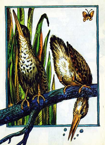«Эх, — думает долгоносый Бекас под кочкой, — надо и мне спеть! Только вот чем? Горло у меня не годится, нос не годится, шея не годится, крылышки не годятся, лапки не годятся… Эх! Была не была, — полечу, не смолчу, чем-нибудь да закричу!»