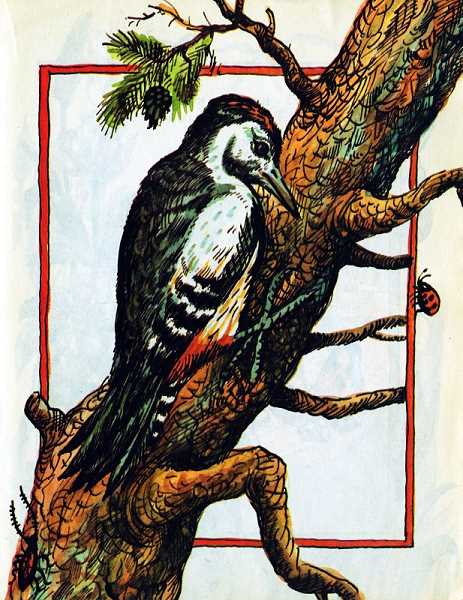 «Вот так песня! — подумал Дятел, услыхав Выпь из лесу. — Инструмент-то у меня найдётся: чем дерево не барабан, а нос мой чем не палочка?»
