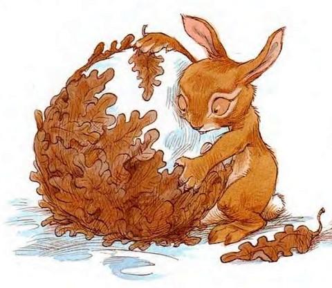 Кролик обернул его бурыми листьями.