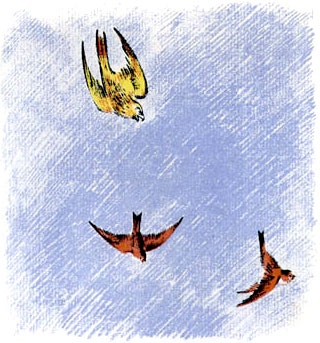 Вдруг — откуда ни возьмись — Чеглок-Сокол мчится. Острые изогнутые крылья так и свистят.