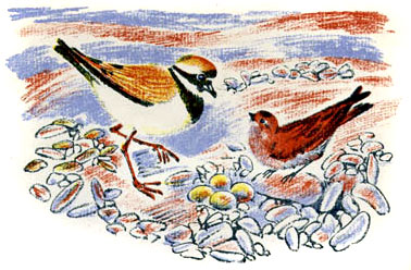 Насилу-насилу разглядела Береговушка: четыре яйца в бурых крапинках лежат рядышком прямо на песке среди гальки.
