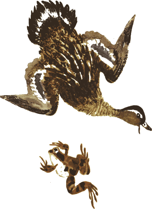 Но утки уж никогда не вернулись. Они думали, что квакушка разбилась о землю, и очень жалели её.
