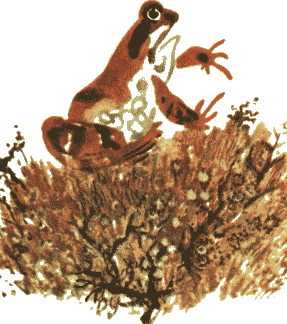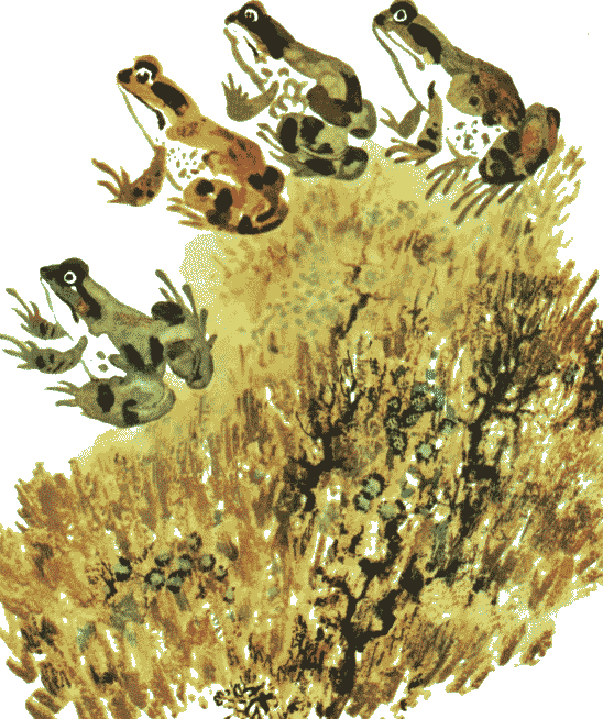 Но вокруг неё никого не было. Испуганные неожиданным плеском, местные лягушки все попрятались в воду. Когда они начали показываться из неё, то с удивлением смотрели на новую.
