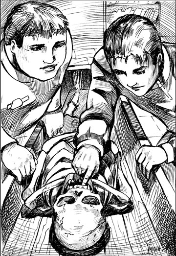 Хорохорясь, Филька просунул палец между челюстями скелета. Внезапно послышался сухой щелчок. Челюсти сами собой захлопнулись, зажав палец.
