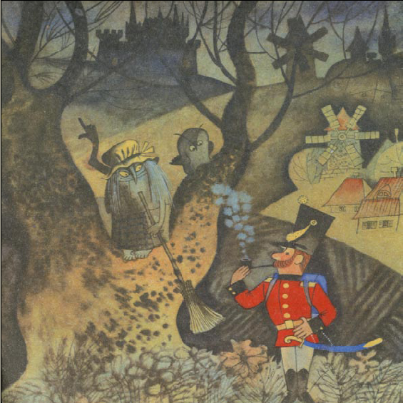 Шел солдат по дороге: раз-два! раз-два! Ранец за спиной, сабля на боку; он шел домой с войны. На дороге встретилась ему старая ведьма — безобразная, противная: нижняя губа висела у нее до самой груди.