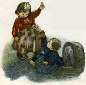 Ухватив со стола кусочек сахара, Окся показывает его Николяю. Братишка тянется за сахаром, Окся отбегает и держит сахар высоко в руке: