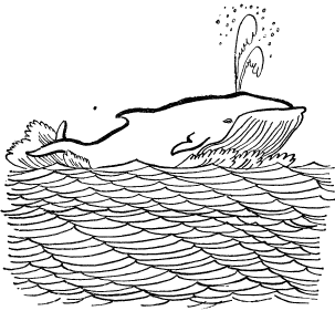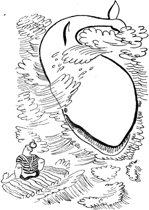 Кит помчался что есть силы. Плыл, плыл и доплыл куда сказано: до сорокового градуса западной долготы и пятидесятого градуса северной широты. Видит, и правда: посреди моря — плот, на плоту — Моряк, и больше никого. На Моряке синие холщовые штаны да подтяжки (смотри же, мой милый, не забудь про подтяжки!) да сбоку у пояса охотничий нож, и больше ничего. Сидит Моряк на плоту, а ноги свесил в воду. (Его Мама позволила ему болтать голыми ногами в воде, иначе он не стал бы болтать, потому что был очень умный и храбрый.)