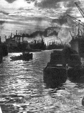 Слева проплывает целая вереница: красный огонь, над ним три белых, а позади — с той же скоростью — тянется еще красный… еще… наконец низко, у самой воды, — белый. Это портовый буксир повел куда-то две баржи.