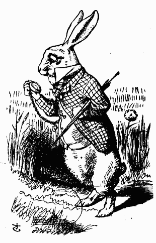 Но и это не показалось Алисе особенно странным. (Вспоминая об этом позже, она подумала, что ей следовало бы удивиться, однако в тот миг все казалось ей вполне естественным.) Но, когда Кролик вдруг вынул часы из жилетного кармана и, взглянув на них, помчался дальше, Алиса вскочила на ноги. Ее тут осенило: ведь никогда раньше она не видела кролика с часами, да еще с жилетным карманом в придачу! Сгорая от любопытства, она побежала за ним по полю и только-только успела заметить, что он юркнул в нору под изгородью.