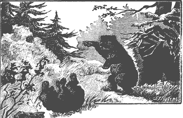 Возня заключается в следующем — надо непременно подтолкнуть один другого в такую минуту, когда этот другой меньше всего этого ожидает… Например, сидит Бурка у порога берлоги и сладко мечтает о том, как вернутся отец с матерью с охоты и принесут нам сладкого меду полакомиться. Ведь Бурка любит больше всего. Она ужасная лакомка, моя сестрица. И, вдруг, незаметно для Бурки, к ней подкрадывается Косолап.