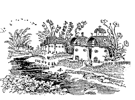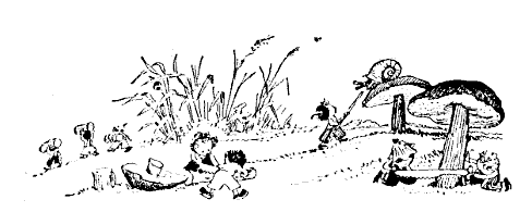 За рекой был лес. Коротышки делали из берёзовой коры лодочки, переплывали через реку и ходили в лес за ягодами, за грибами, за орехами. Собирать ягоды было трудно, потому что коротышки ведь были крошечные, а за орехами и вовсе приходилось лазить на высокий куст да ещё тащить с собой пилу. Ни один коротышка не смог бы сорвать орех руками — их надо было пилить пилой. Грибы тоже пилили пилой. Спилят гриб под самый корень, потом распилят его на части и тащат по кусочкам домой.