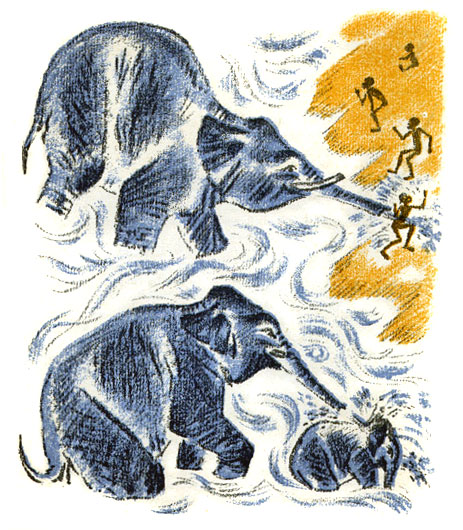 Слон опять своего мыть. А ребята еще пуще камешками его донимать. Слон только ушами трясет: не приставайте, мол, видите, некогда баловаться! И как раз, когда мальчишки не ждали, думали — он водой на слоненка дунет, он сразу хобот повернул да в них.