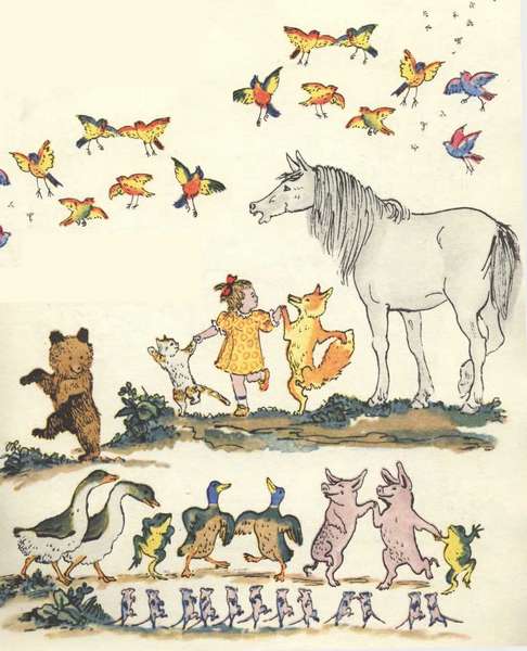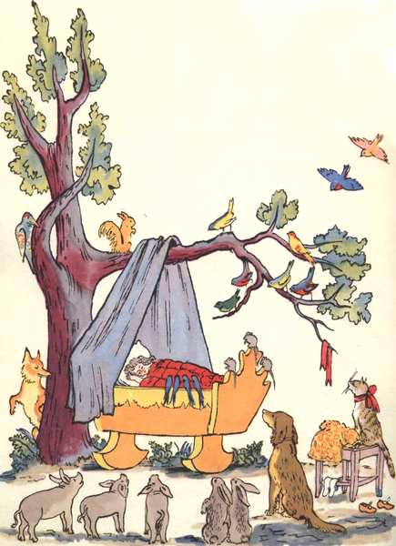 Гуси начали опять По-гусиному кричать: Га-га-га! Кошки замурлыкали: Мур-мур-мур! Птицы зачирикали: Чик-чирик! Лошади заржали: И-и-и! Мухи зажужжали: Ж-ж-ж! Лягушата квакают: Ква-ква-ква! А утята крякают: Кря-кря-кря! Поросята хрюкают: Хрю-хрю-хрю! Мурочку баюкают Милую мою: Баюшки-баю! Баюшки-баю!