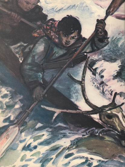 Севери́н сидел в чуме старого Тункая и смотрел, как он вырезает из кости олешка. И сам олень-то невелик, а рога у него и вовсе маленькие! Нажимает Тункай остро отточенным лезвием ножа на желтоватую крепкую кость, и вот из неб выступает один отросток рога, другой… оживает олень. Будто увидел старик в куске моржовой кости этого оленя и выпустил на волю.