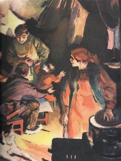 Тепло и уютно было в чуме. Норка дремала у ног Северина. Пришла из соседнего чума бабушка Анна. Усевшись на оленьи меха, она стала помогать матери шить тобоки. Тобоки шьются из шкурок, снятых с ног оленя. Сначала их выделывают, чтобы они стали мягкими, а затем сшивают оленьими жилами.
