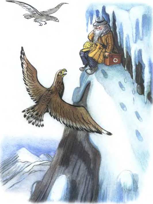 И сейчас же с высокой скалыК Айболиту слетели орлы:«Садись, Айболит, верхом,Мы живо тебя довезём!»И сел на орла АйболитИ одно только слово твердит:«Лимпопо, Лимпопо, Лимпопо!»