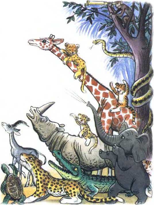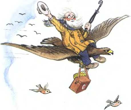 Нo вот, поглядите, какая-то птицаВсё ближе и ближе по воздуху мчится.На птице, глядите, сидит АйболитИ шляпою машет и громко кричит:«Да здравствует милая Африка!»