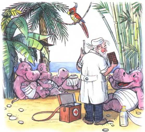 А птица над ними кружится,А птица на землю садится.И бежит Айболит к бегемотикам,И хлопает их по животикам,И всем по порядкуДаёт шоколадку,И ставит и ставит им градусники!
