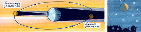 Раз в месяц Луна проходит «позади» Земли. При этом она иногда пересекает тень, которую отбрасывает Земля. На некоторое время наша планета загораживает от Луны Солнце. Луна погружается в мрак. Происходит лунное затмение. Вы, наверно, не раз видели его.