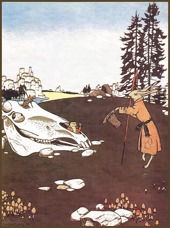 Никто не отзывается. Вот она вошла и стала жить в лошадиной голове. Пришла лягушка-квакушка: