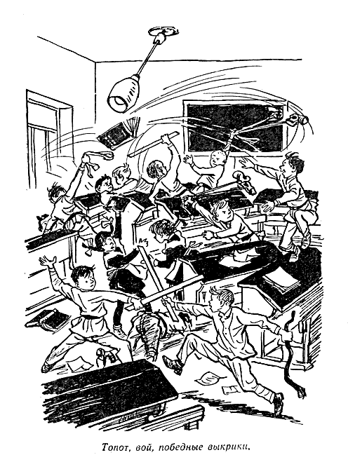 Лампы под потолком раскачиваются. Классная доска вспотела от напряжения, чтобы удержаться на стене. О вазонах с цветами, которые перед этим стояли на полочке, и говорить нечего: они давно на полу. Хрустят, разламываются на мелкие черепки. Топот, вой, победные выкрики.