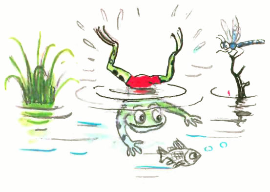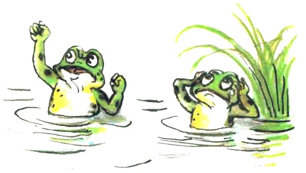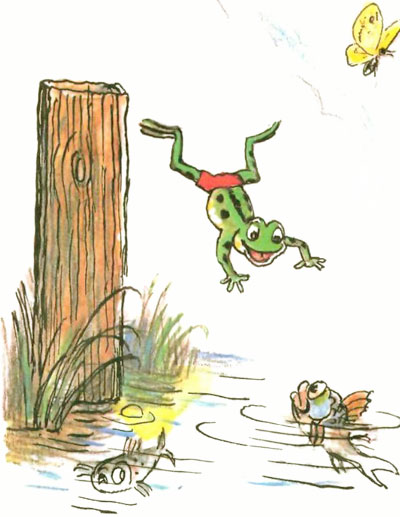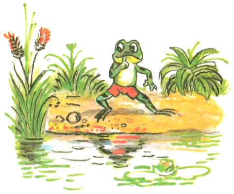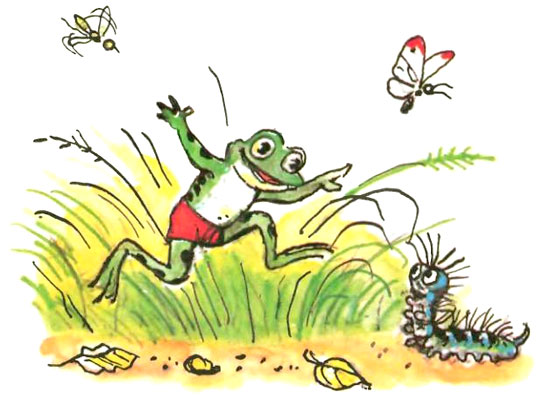 Рисунки В. Сутеева Родился Лягушонок За городом, в пруду. Он рос у папы с мамой Всё время на виду. И громче всех он квакал, И прыгал далеко, Но было папе с мамой С ребёнком не легко. Была строга с ним мама, Был папа тоже строг, Но всё ж его упрямства Никто сломить не мог. Он как-то оказался Один на берегу, И про себя решил он: — Возьму и убегу! Пусть взрослые лягушки Сидят себе в пруду. Когда я нагуляюсь, Тогда домой приду! — И квакнув: — До свиданья! — Всё дальше прыг да прыг! Широкой автострады Он к вечеру достиг. По гладкому асфальту Неслись машины в ряд, Они жучков и мошек