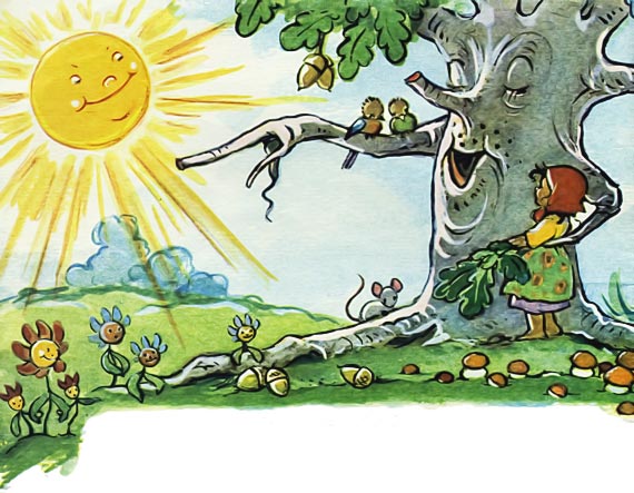 Но луна глядит сквозь ветви,Говорит: — Уж поздно, дети,Даже я светить устала,Старым спать пора и малым.… Тишина в шатрах бездонна,Но в лесу безмолвном, сонномРингле маленькой не спится,Хочет меду баловница.Ветерок ей шепчет тихо:— Рингла, ты не будь трусихой.Вот вблизи шатра тропинка.Каждый листик и травинка,И фиалки манят с ласкойПрямо в сказку, прямо в сказку.Сник давно в костре огонь.Положила на ладоньГолову луна и дремлет.Тишина укрыла землю,Лишь комар ее тревожит,Отыскать свой дом не может…И на цыпочках, неслышноУбегает в лес малышка.— Ох, куда же так спешу я!Нет уж, лучше расспрошу я,Где же к Ричусу дорога?..Дуб огромный смотрит строго,Он всех выше, всех умнее.Но нисколько не робея,Говорит ему беглянка:— Я ушла с родной полянки,Ричуса найти должна я.Где живет он? Знаешь?— Знаю.И тебе скажу я, ноСделай дело мне одно.Сыплю жёлуди горстями —Прорастают пусть дубками.Но придет кабанье стадоИ себя спасать мне надо.Так мне корни подрывают,Что и силы убывают.Все-то жёлуди проглотят.Всю-то землю разворотят.Мне бы сразу легче стало,Если б ты их подобрала,Унесла отсюда прочь…Рингла трудится всю ночь,Носит жёлуди в подоле.