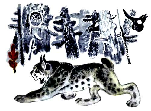 Не вздумайте погладить эту кошку, если встретите её в лесу: это не домашняя кошка Мурка, а дикая. Ох, и злая! Как выпрыгнет, как выскочит, зафыркает, зашипит — шерсть дыбом, спина дугой, хвост трубой… На собак сама кидается, лисиц и барсуков не боится: хозяев из их же нор выгоняет. С дерева вниз прыгает — даже на косуль и молодых оленей. Зайца увидит — на зайца прыгнет. Птиц разных, мышей, белок ловит, даже змей и ящериц ест. На глухарей, говорят, так охотится: ночью, когда глухари спят на соснах, лезет на сосну. Подкрадётся к сонному глухарю, схватит его и с ним падает прямо вниз.