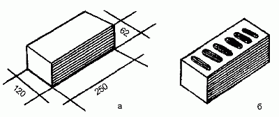 Рис. 1. Виды кирпича: а – одинарный полнотелый керамический кирпич; б – керамический кирпич с вертикальными пустотами