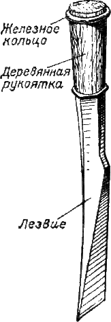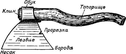 Из плотничного инструмента главнейшим является топор, состоящий из железной части, насаженной на топорище из дерева крепких пород. Названия отдельных частей топора видны из рис. 1, причем лезвие служит для тески, а обух – для заколачивания. Наиболее рабочей частью лезвия является «носок». Прорезка, которая делается не у всех топоров, служит для выдергивания гвоздей. Железный клин предохраняет топор от соскакивания с топорища. Топор делается железный, а лезвие и обух навариваются сталью. Топором выполняется большая часть плотничной работы: теска, выборка четвертей, перерубание, устройство врубок, заколачивание скоб, гвоздей и т. д.