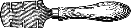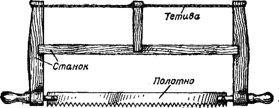 Для более мелких пропил служит лучковая пила (рис. 10), полотно которой укреплено в деревянном станке, а для натяжения полотна служит веревочная тетива, туго накручиваемая особой деревянной защелкой. Пилы бывают с крупным, средним и мелким зубом – сообразно размеру изделия. Лучковою пилою может работать один человек. Лучковая пила с очень узким полотном называется поворотною.
