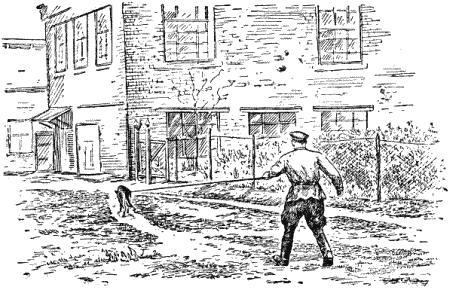 Собаки сторожевой службы даются в помощь охране. Сторожевая собака, сопровождающая охрану, находится на поводке (рис. 5). Натягиванием поводка она оповещает охрану о появлении на охраняемой территории посторонних, а в случае необходимости применяется охраной для защиты от нападения или для преследования и задержания лиц, проникших на охраняемый участок.