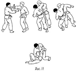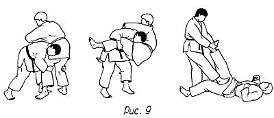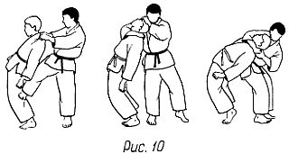 в) Приставив левую ногу к правой, подбейте противника тазом и усилием туловища и рук проведите бросок влево-вниз, после чего нанесите удар ногой в промежность.