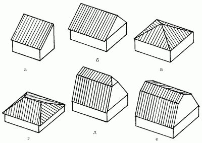 Рис. 1. Типы крыш: а – односкатная; б – двускатная; в – шатровая; г – вальмовая; д – полувальмовая; е – мансардная.