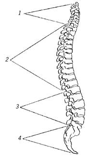 1 – шейный лордоз; 2 – грудной кифоз; 3 – поясничный лордоз; 4 – крестцовый кифоз