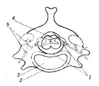 1 – связки; 2 – фиброзное кольцо; 3 – студенистое ядро; 4 – спинной мозг; 5 – корешки спинномозговых нервов