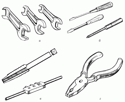 Рис. 1. Ручной инструмент: а – комплект гаечных ключей; б – комплект отверток; в – метчик с воротком; г – пассатижи с изолированными ручками.