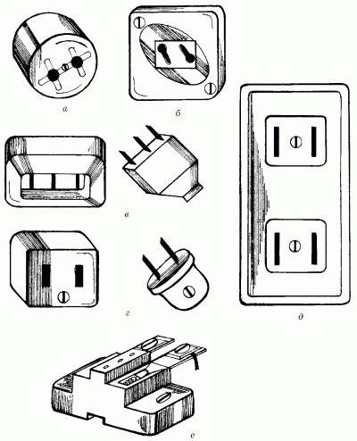Рис. 11. Разновидности штепсельных соединений: а – розетка для открытой установки; б – розетка для скрытой установки; в – трехконтактная розетка; г – штепсельное соединение с плоскими контактами; д – розетка для подключения двух вилок; е – конструкция механизма розетки с прижимной пружиной.