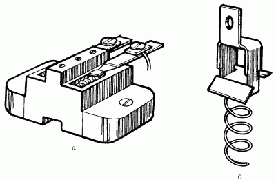 Рис. 12. Конструкция розетки с прижимной пружиной: а – основание унифицированной розетки; б – контактный узел с прижимной пружиной.