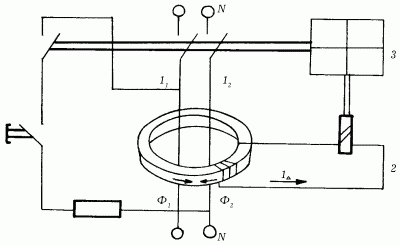 Рис. 17. Структура устройства защитного отключения: 1 – дифференциальный трансформатор тока; 2 – пороговый элемент; 3 – исполнительный механизм.