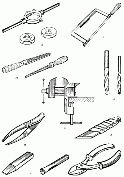 Рис. 1 (продолжение): д – плашка с плашкодержателем; е – ножовка по металлу; ж – напильники; з – набор сверл; и – небольшие тиски; к – пинцет; л – монтажный нож; м – зубило и шлямбур; н – бокорезы с изолированными ручками.