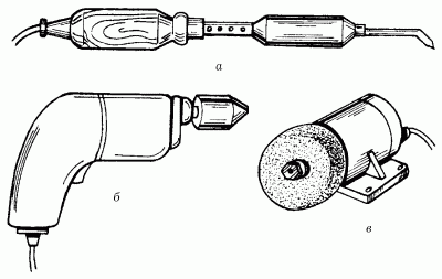 Рис. 2. Электроинструменты: а – электропаяльник; б – электродрель; в – электроточило.